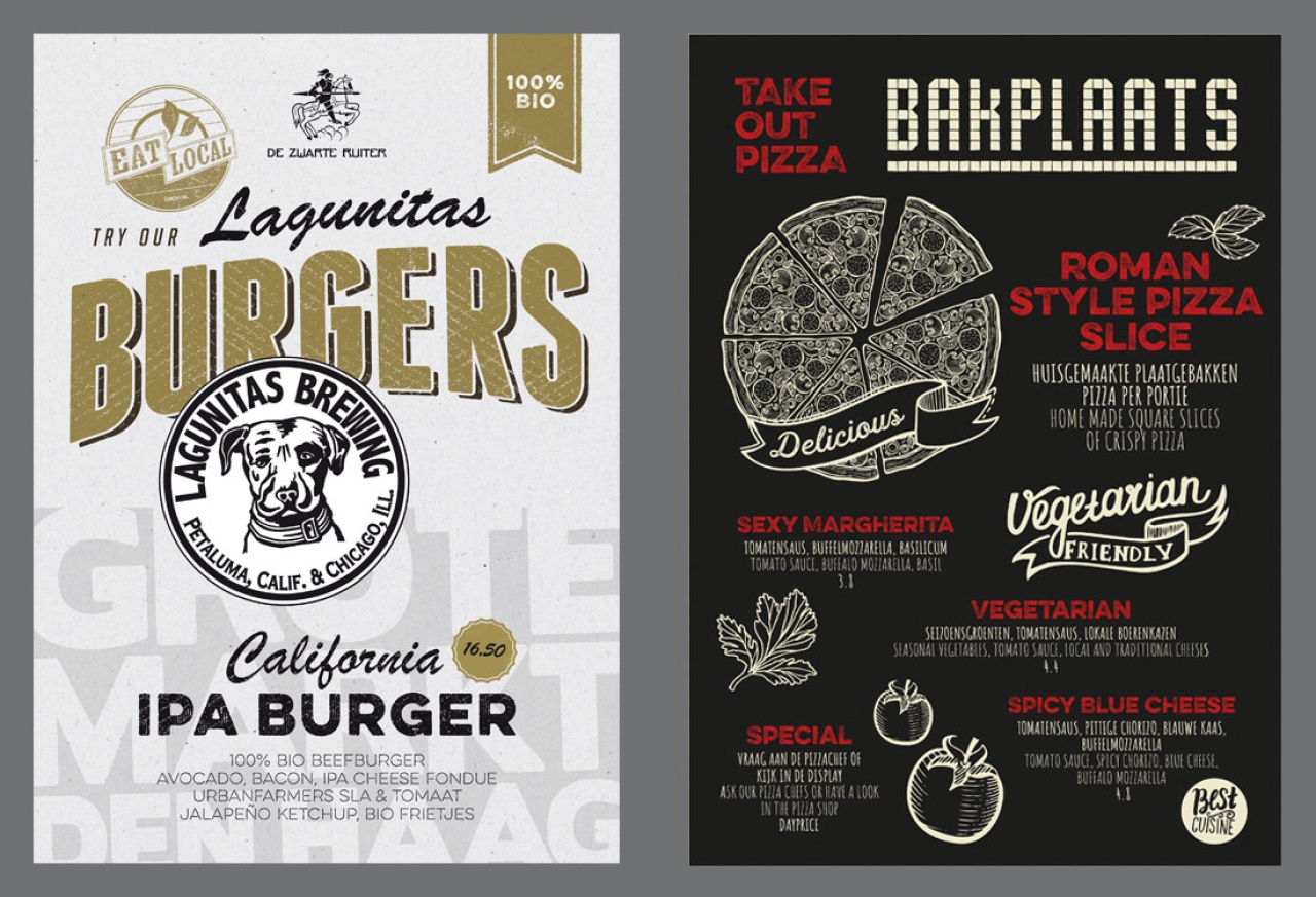 Het meest toonaangevende uitgaansgebied in Den Haag; de Grotemarkt, heeft ook communicatie nodig. Menukaarten, brochures, posters en stickers krijgen een even toonaangevende uitstraling.